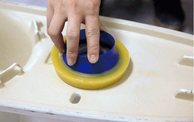 แกะพลาสติกที่ห่อหุ้ม Wax Ring ออก กด Wax Ring ให้ยึดติดแน่น และตรงกลางศูนย์กับรู Outlet ที่โถส้วม